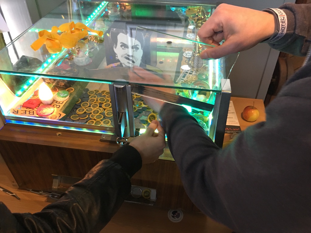 The mirror panel can be openened for servicing the playing field. It was used to insert prize tokens for players. You can just open it any time with ease.